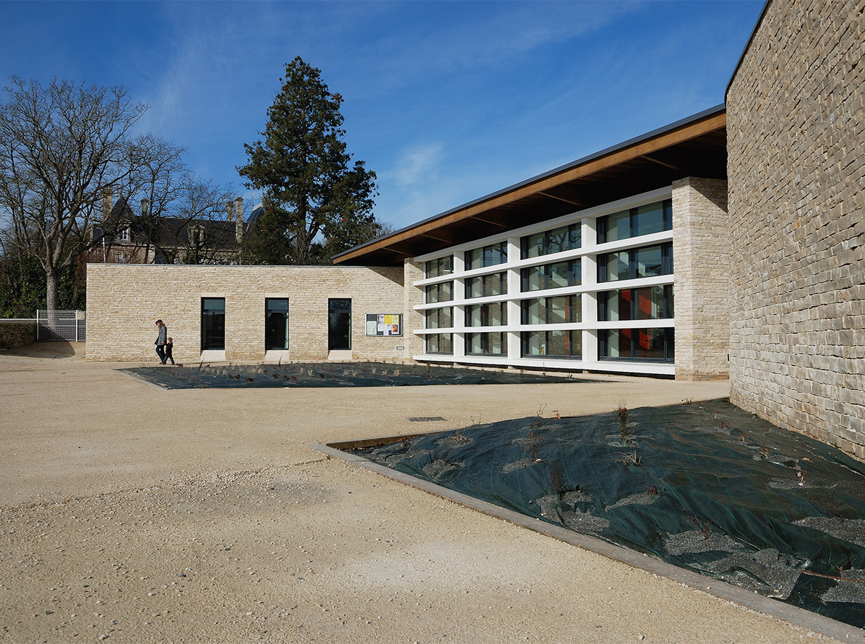 Implanté en limite sud de bourg, ce groupe scolaire est aménagé à l’intérieur d’un parc derrière un mur en pierre conservé.
