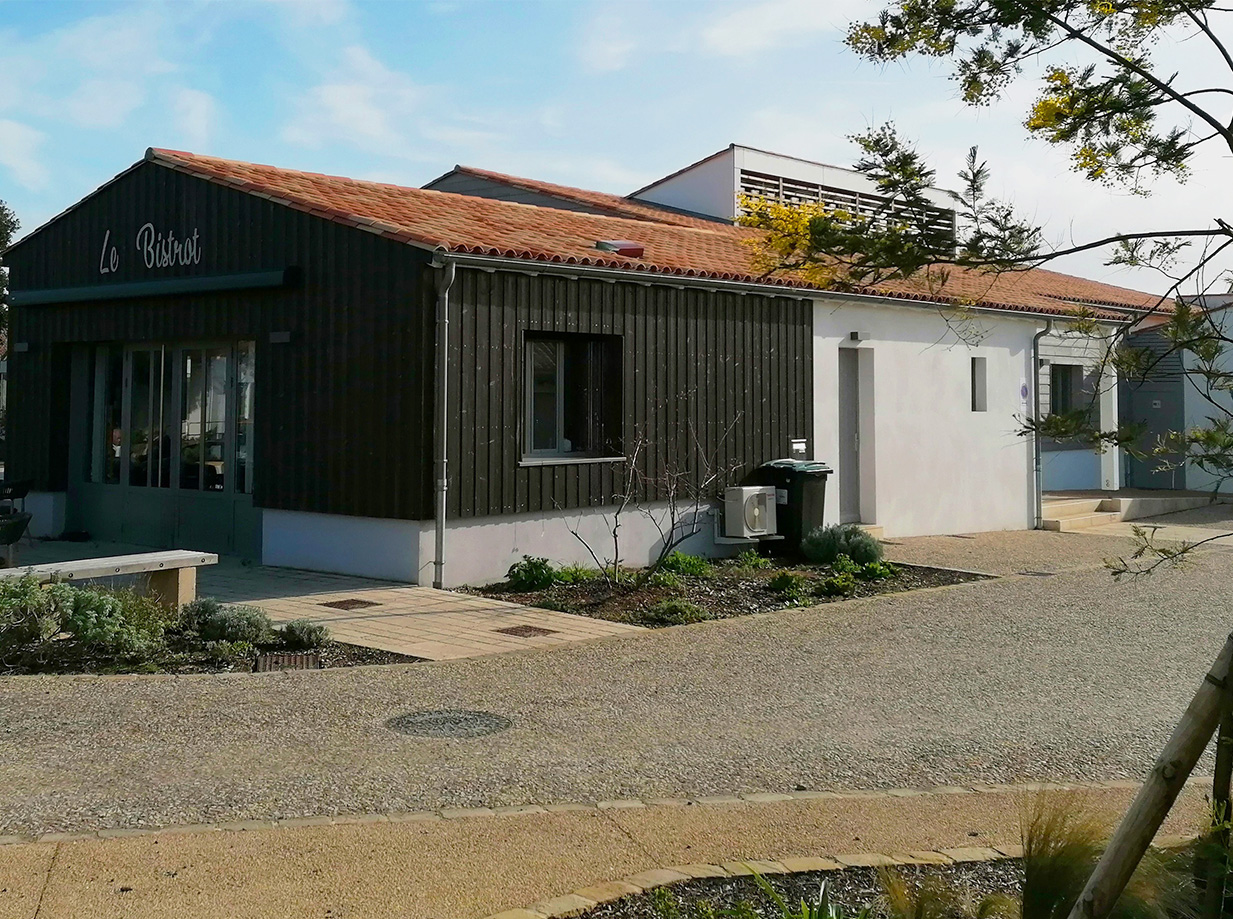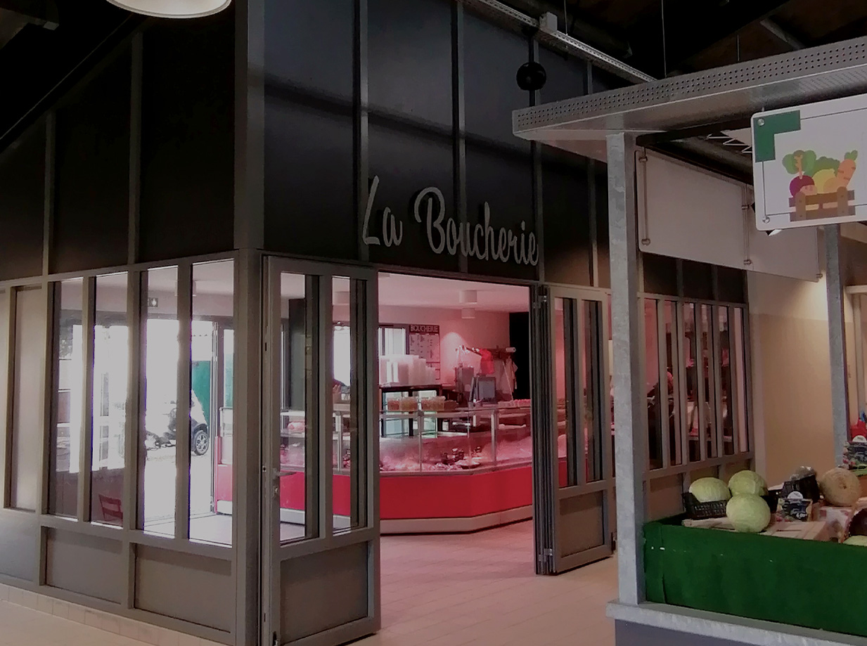 Réhabilitation d’un ancien bâtiment en marché couvert, concept intégrant 2 commerces, une boucherie et un bar, ouverts à la fois sur le marché et accessibles directement depuis la place d’Antioche.